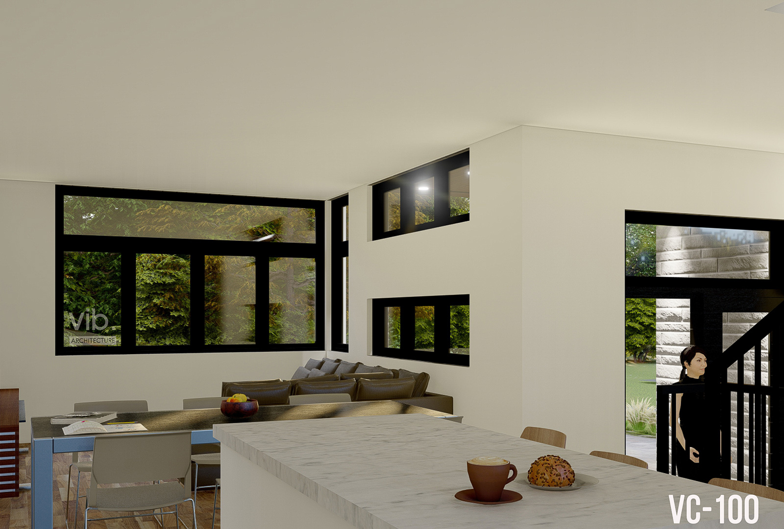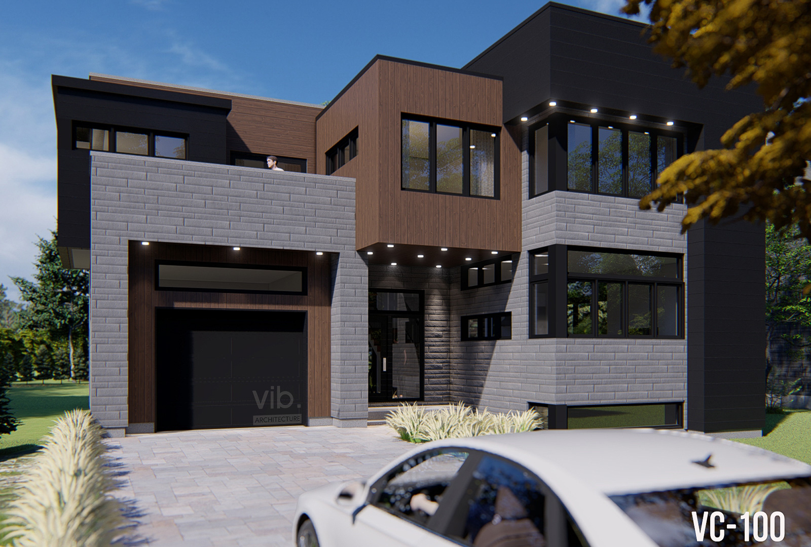 Le plan C-100 se caractérise par sa volumétrie cubique et par le mélange des matériaux qui accentuent ses volumes. Ceux-ci lui donnent un style moderne et industriel. Le rez-de-chaussée s’ouvre sur une entrée avec garde-robe walk-in et un accès direct au garage. La porte-fenêtre dans l’escalier permet une sortie au niveau du sol du côté cours arrière, donc pas de balcon. Les pièces de vie sont ouvertes et les fenêtres sont judicieusement positionnées pour permettre de placer les meubles dessous. À l’étage, la chambre principale possède son propre balcon privé et intime en façade.