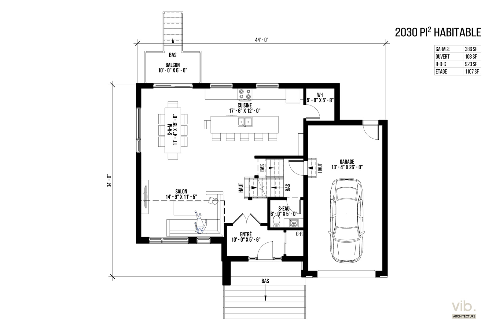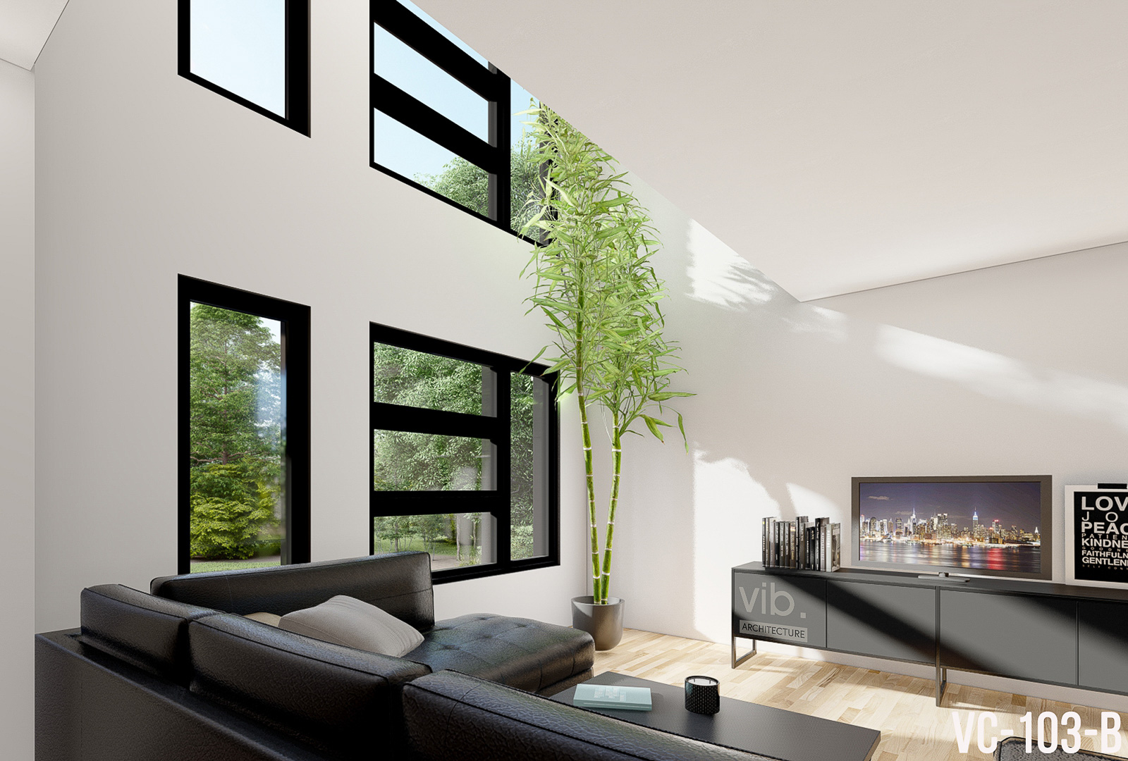 Le plan C-103-B offre un espace très fonctionnel. La chambre principale située au-dessus du garage pourrait se transformer en grand bureau ou en salle de jeux si 4 chambres ne sont pas nécessaires. Une partie du salon est ouverte sur 2 étages, ce qui permet un apport de lumière considérable. La salle à manger et la cuisine sont très grandes et permettent de recevoir plusieurs personnes. Le plan peut être modifié pour ajouter un garage de façon à avoir un garage double.