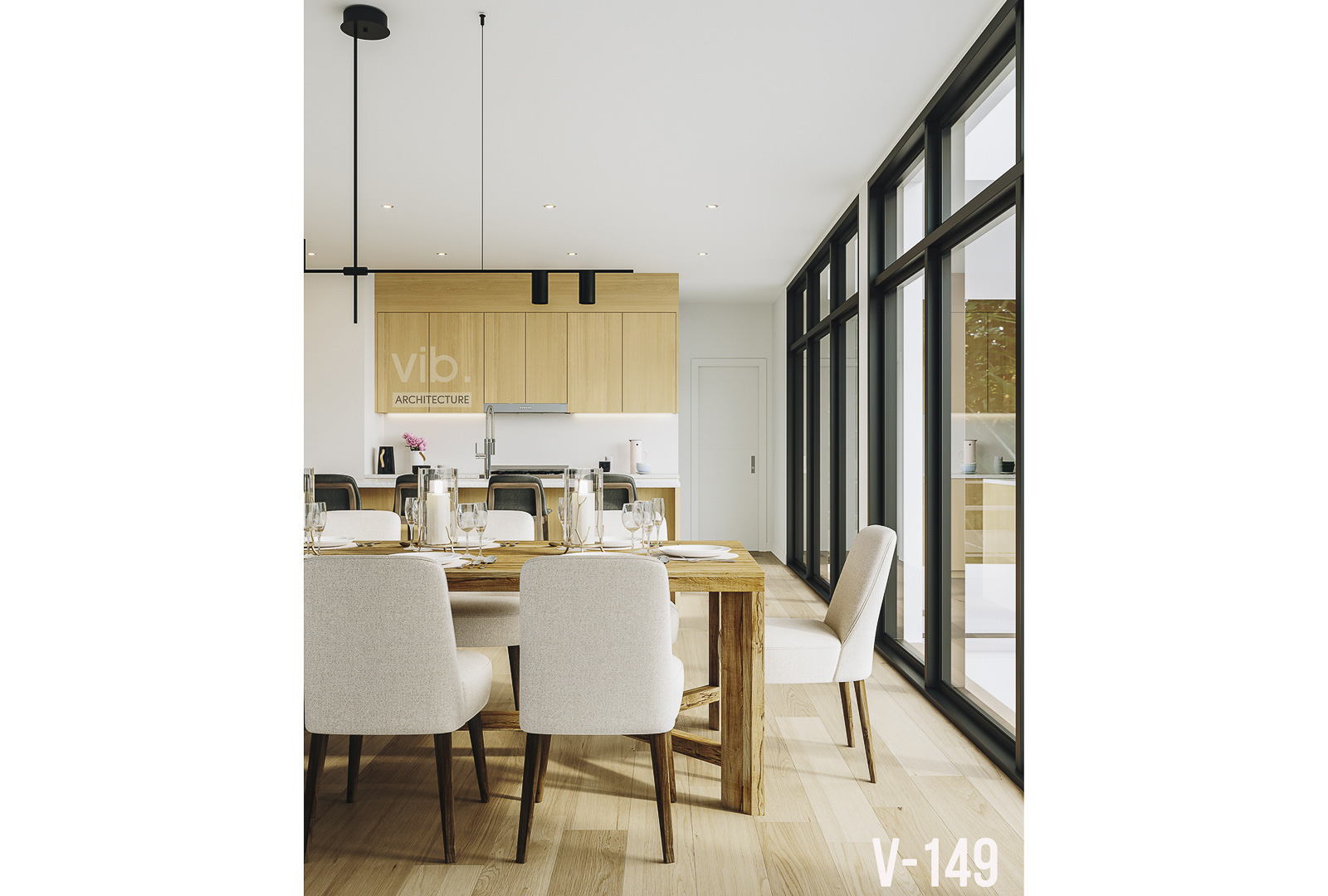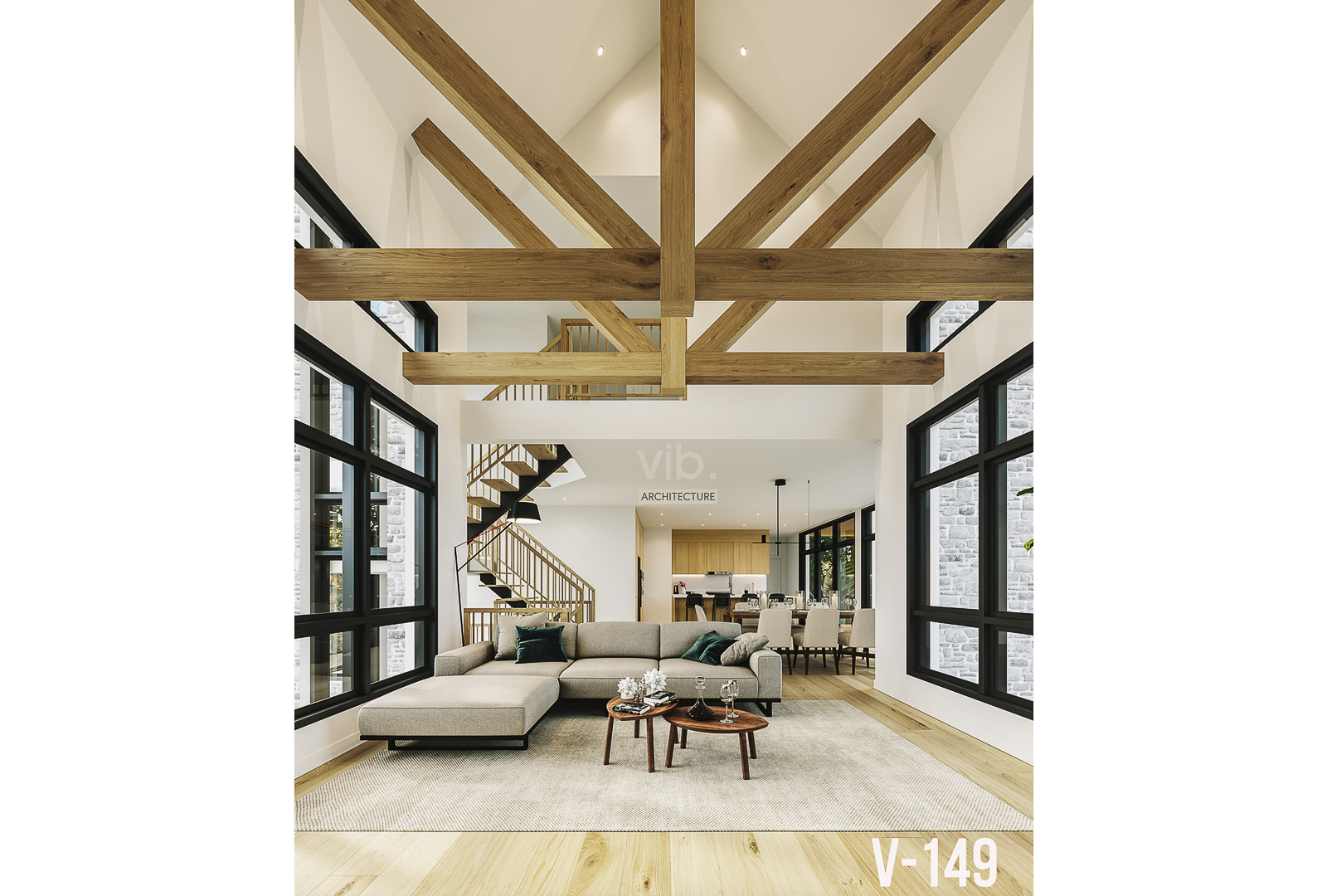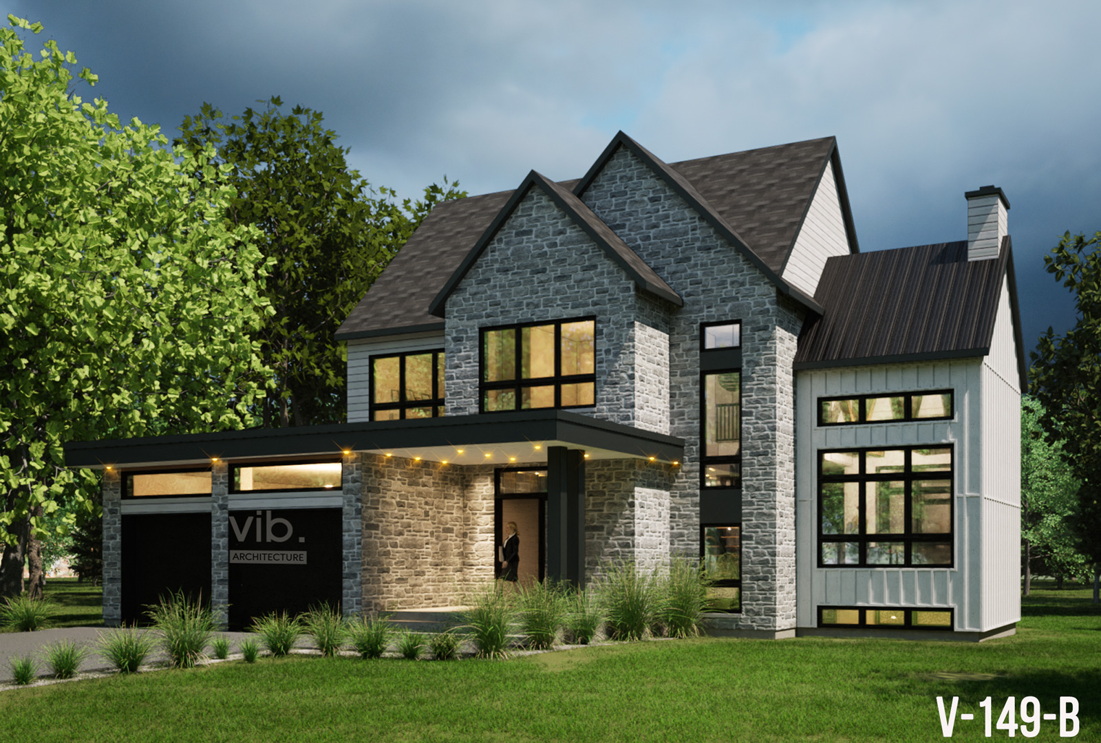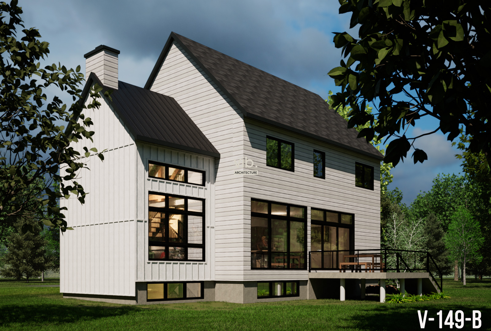 Le plan V-149-B est une version plus abordable du V-149-A. La construction a été simplifiée, et la superficie a été diminuée. Ce plan peut facilement être adapté selon vos besoins. Exemple : toit du garage en pente, déplacer la salle d’eau, agrandir le salon, etc. Les grandes ouvertures de la cuisine et de la salle à manger, ainsi que les fenêtres dans l’escalier contribuent à inonder de lumière cette maison. L’étage peut être réaménagé selon vos désirs.