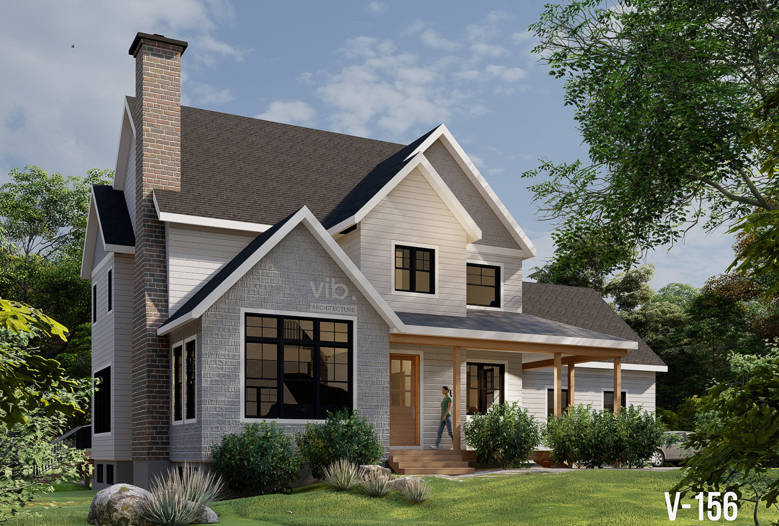 Le plan V-156 est une grande maison de style champêtre aménagée sur 2 étages avec garage double. Conçue afin d’être très fonctionnelle et tendance avec les espaces de vie à aire ouverte. Près de l’entrée, un grand bureau peut recevoir des clients sans que ceux-ci aient à traverser la maison. Le grand salon, ouvert sur 2 étages, est le cœur de la maison, avec son foyer au bois et son plafond pleine hauteur il est le lien entre toutes les pièces. La cuisine est vaste et fonctionnelle. Situé près du garage se trouve un petit vestibule avec salle de lavage et salle d’eau. À l’étage se retrouvent une chambre principale avec plafond cathédrale de 11 pieds, un grand walk-in ainsi qu’une salle de bain privée. Les deux chambres secondaires sont grandes et se partagent une salle de bain.