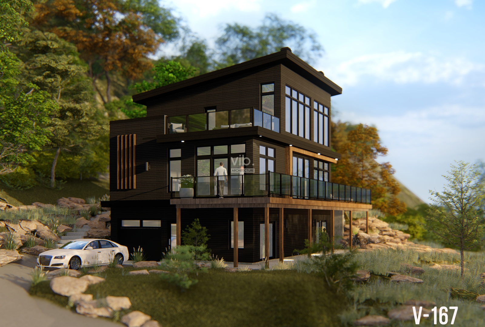 Le plan V-167 est définitivement impressionnant, s'étendant sur 3 étages, y compris le rez-de-jardin. Ce chalet offre une fenestration abondante, pouvant procurer une vue sur des montagnes ou un lac. Vous pourrez vous retrouver avec vos proches pour festoyer ou simplement vous ressourcer seul. Les espaces de vie et la chambre principale sont baignés de lumière. De vastes balcons et une pièce d'été sont judicieusement disposés au rez-de-chaussée, ajoutant à l'attrait irrésistible de cette résidence. L'étage peut accueillir deux chambres ou être aménagé exclusivement en chambre principale.